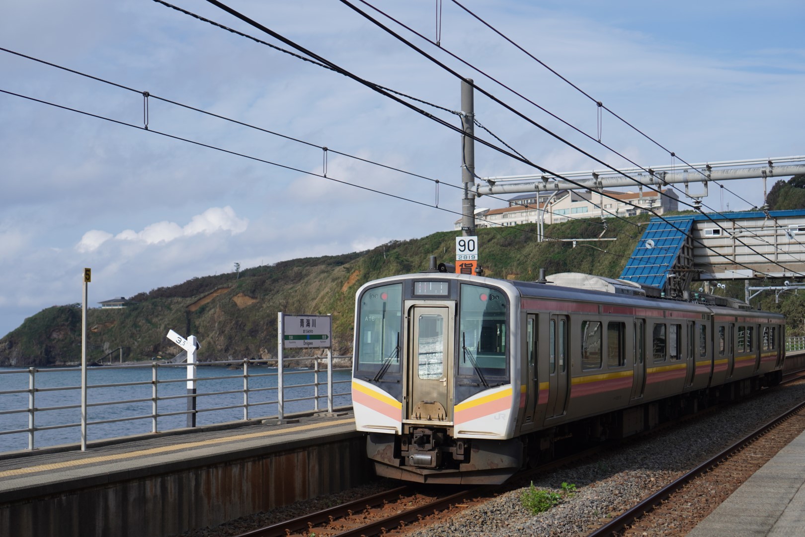 長岡駅で直江津行き普通列車に乗り換え、西を目指します。目的地は柏崎市、青海川駅。「日本一海に近い駅」を名乗っているようです。他にも海に近い駅いっぱいある!と言いたくなりますが、この青海川駅、景色は格別です。ホームからは静かな日本海が広がり、青く輝く海面が水平線まで続いています。