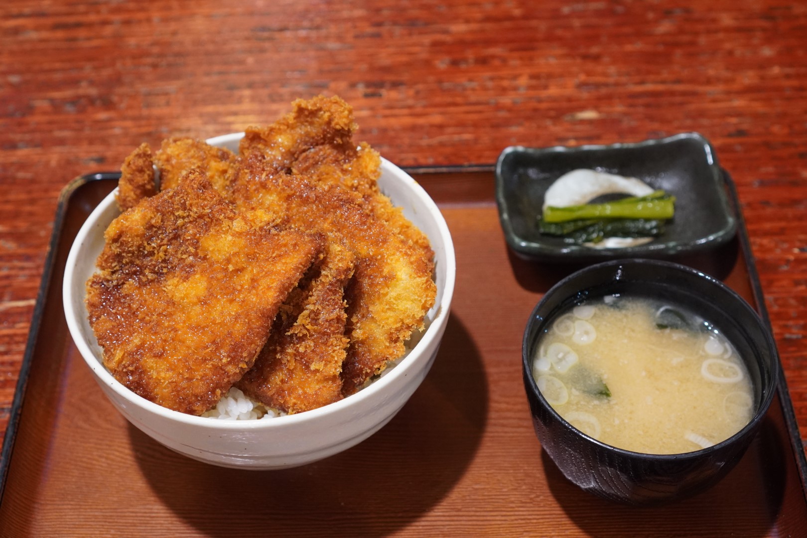 出てきたのはヒレカツたっぷりのどんぶり。次の電車が迫る中急いで食べました。