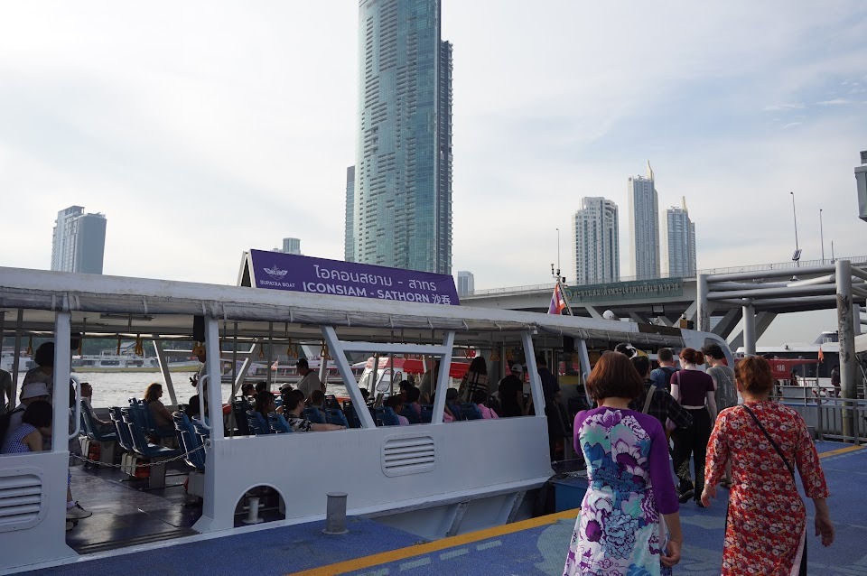 次はツーリストボートで移動します。チャオプラヤ川には、現地の方々が利用する定期船とは別に、外国人向けのボートがあります。料金は高いものの、船が2階建てで2階からの景色がよく、英語の案内もあるので安心です。
