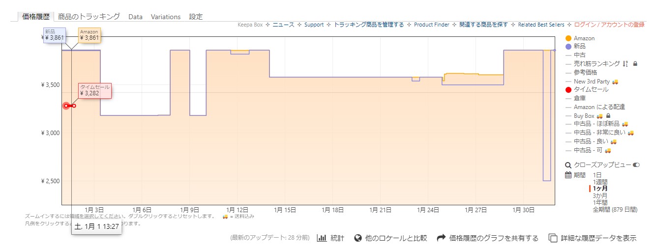 セールの時期はある程度決まっているので、Keepaで過去のセール時期の価格を見れば一目瞭然。