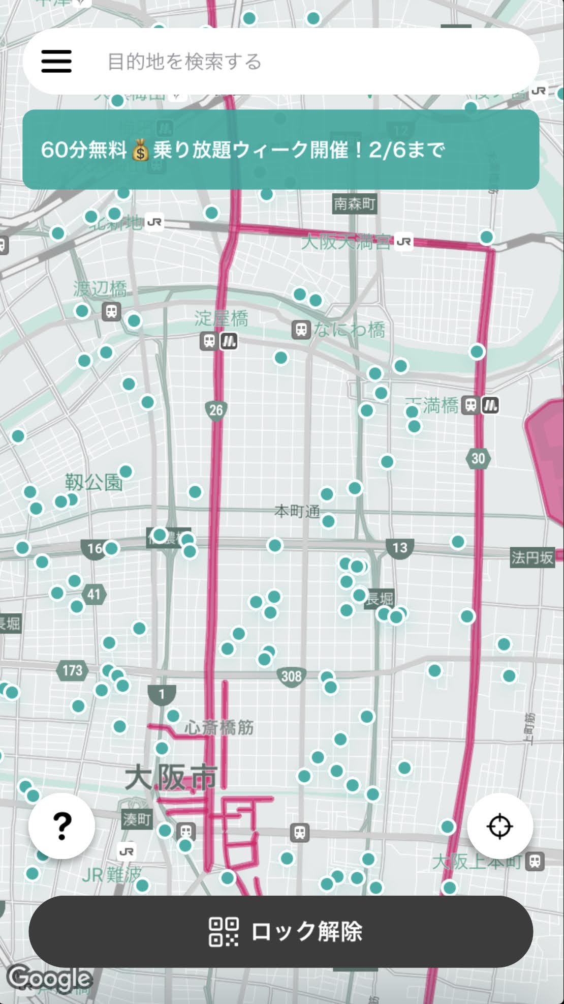 御堂筋を含む一部の幹線道路や繁華街は、LUUPから「手押しエリア」として指定されています。